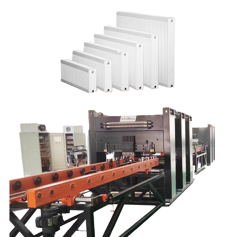कार्यप्रवाह:Panel truss loading machine → Water channel ring loading and pressing machine → Turning and assembling machine 1 → Panel pre-spot positioning welding machine → Panel gantry multi-spot welding machine → Convection sheet pre-spot welding machine → Convection sheet gantry multi-spot welding machine → U-shaped line transfer conveyor → Long side double-head seam welding machine → Gantry double-head short side seam welding machine 1 → Gantry double-head short side seam welding machine 2 → Two-side cleaning and trimming machine → Shearing machine → Four-corner arc cutting machine → Turning and assembling machine 2 → Double-head three-way automatic welding machine → Support hook automatic welding machine → Automatic pressure airtightness detection machine → Discharging conveyor